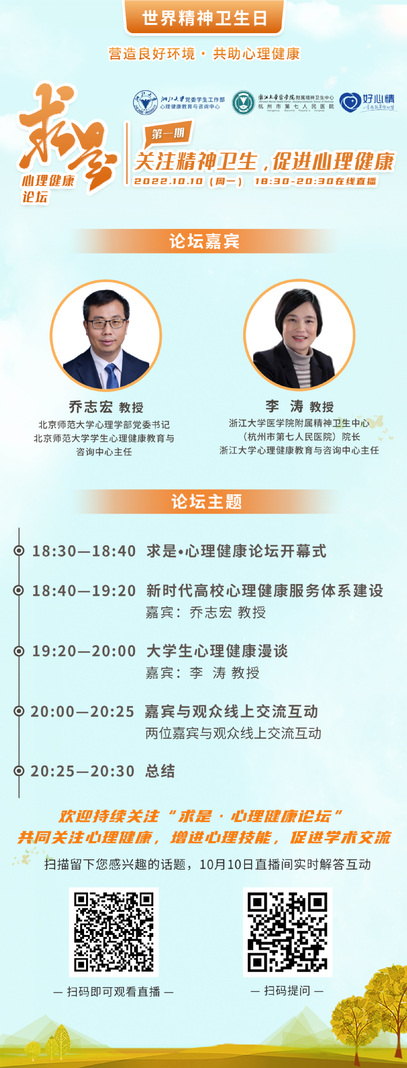 10月10日是第31个世界精神卫生日,主题为“营造良好环境,共助心理健康”,力求通过多种途径的宣传活动,推动全社会提高认识,营造维护和促进心理健康和精神卫生的良好氛围,提供适宜的心理支持和心理健康服务,提升心理健康和精神卫生水平。求是·心理健康论坛的首期直播以“关注精神卫生,促进心理健康”为主题,邀请业内专家共话心理,共同推动形成关爱、理解、友善、支持的良好公众社会氛围,助力心理健康良性发展。